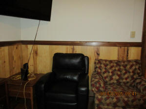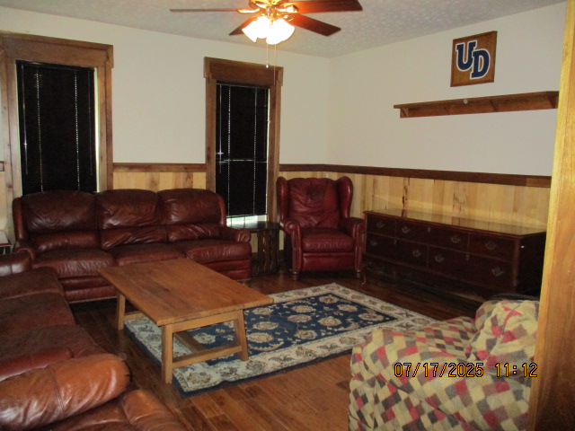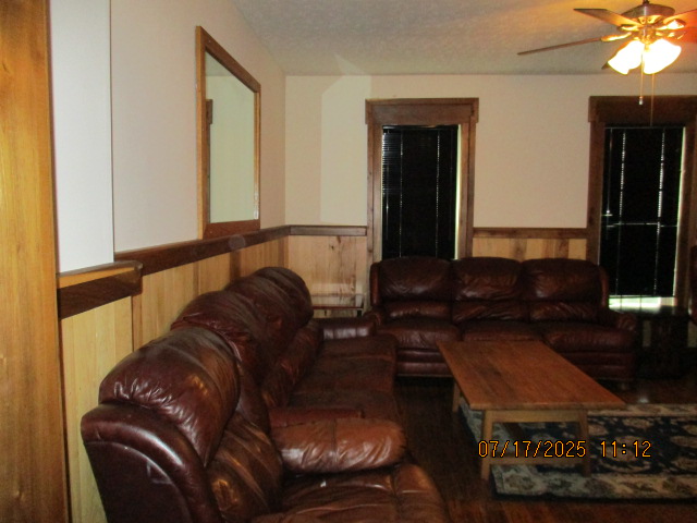 Oak Wood Flooring, Fan, Wall mounted flat screen television, coffee table, End Tables, Simply beautiful with