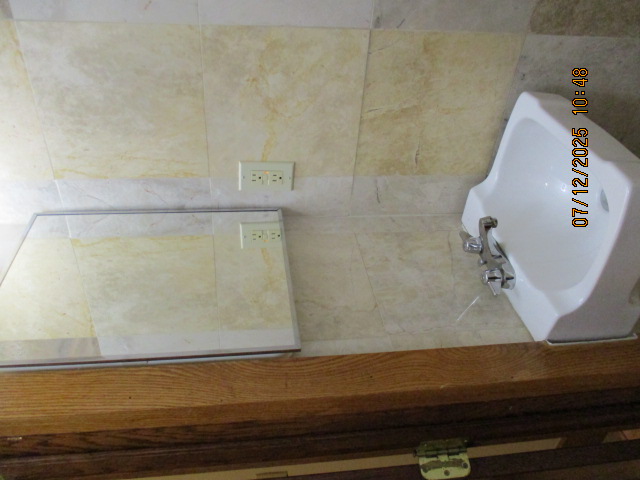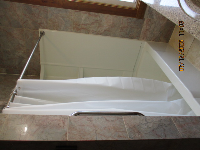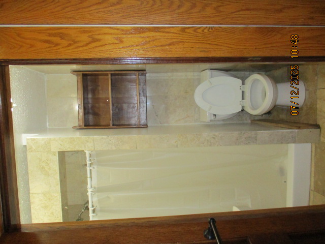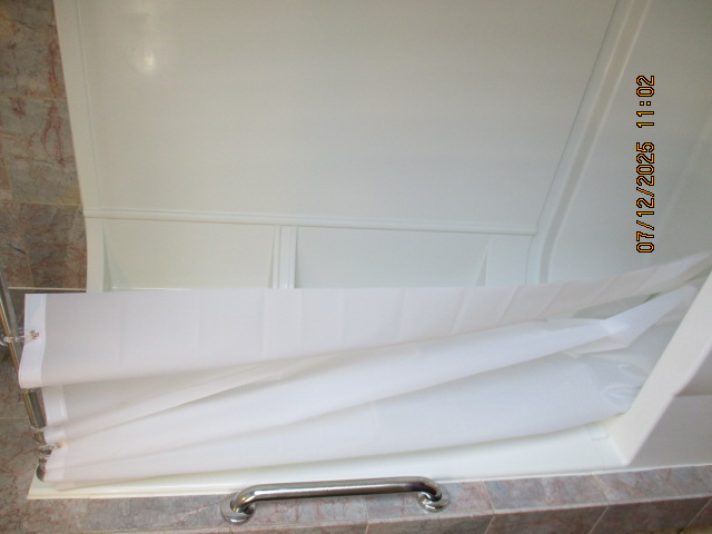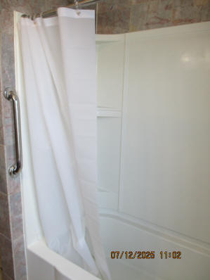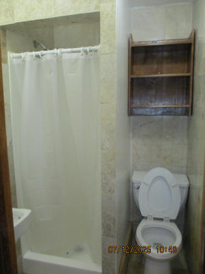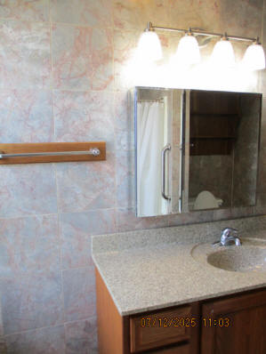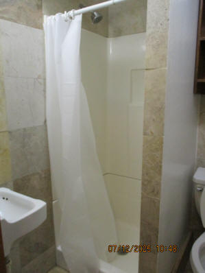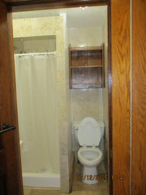 Downstairs Bathroom with Marble walls with Shower, Entry door to basement
