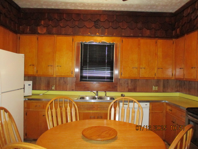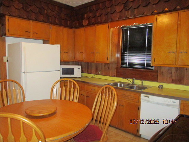 black walnut shelf, tile flooring, ceiling fan, microwave and dishwasher