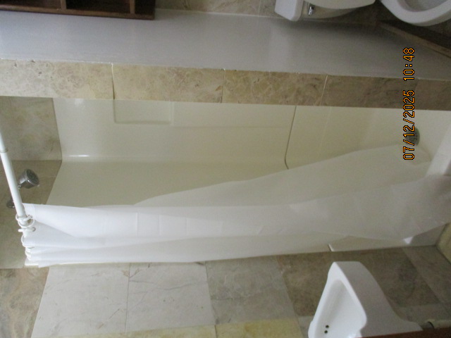 with marble tile walls, commercial bath tub, vanity with marble top,