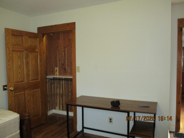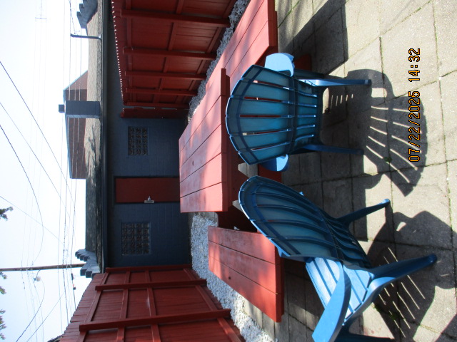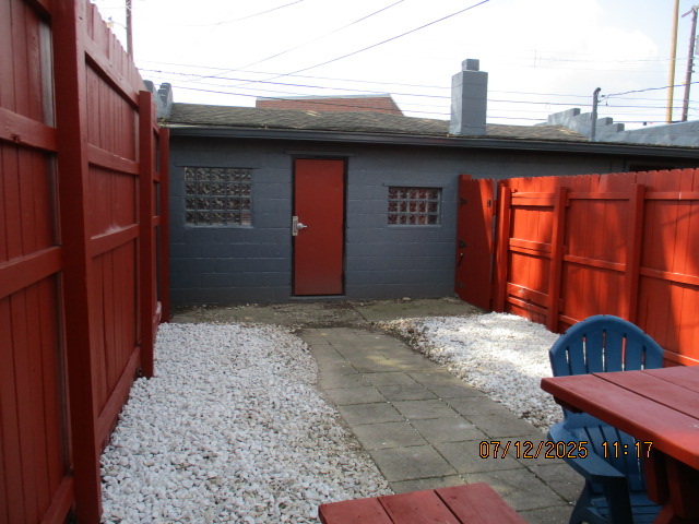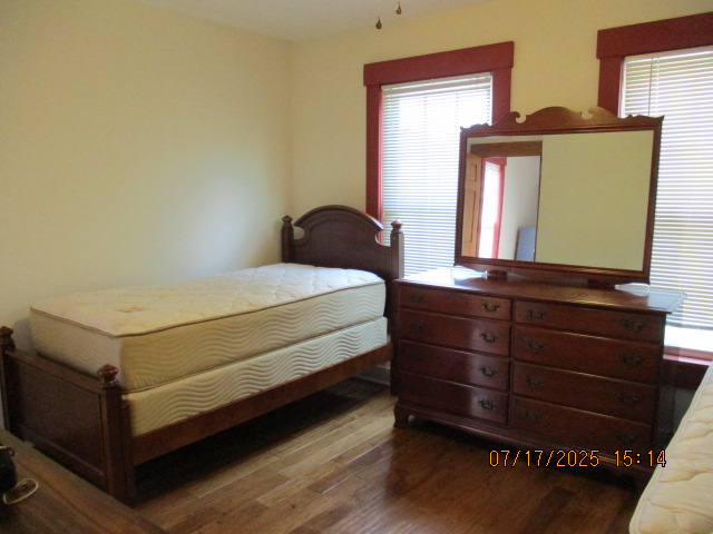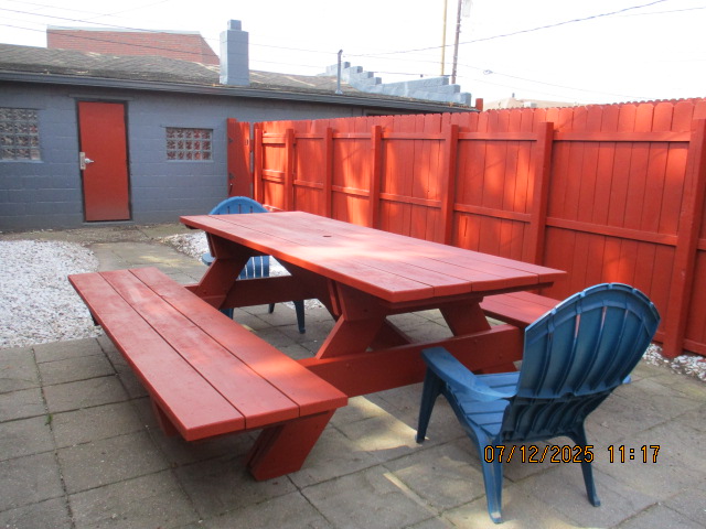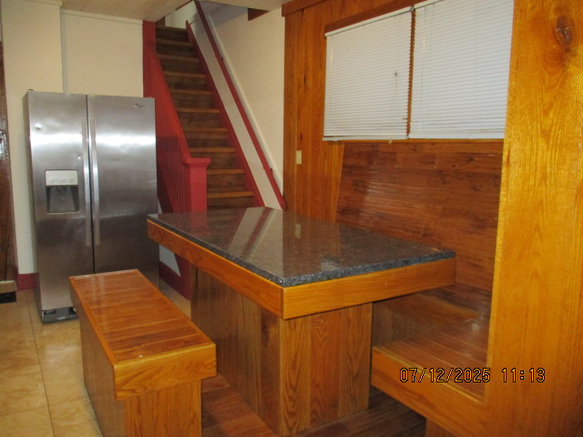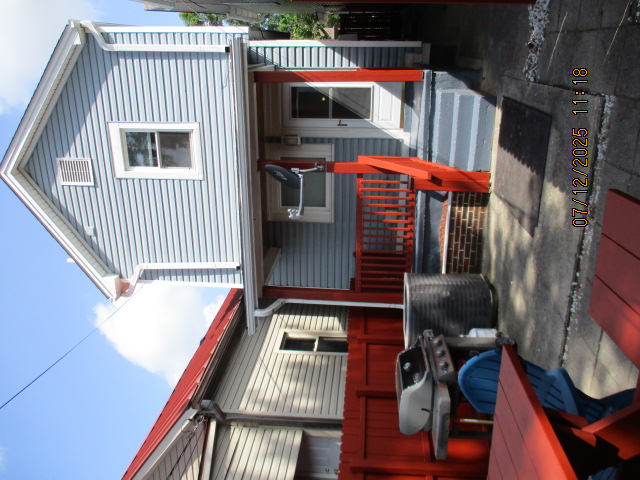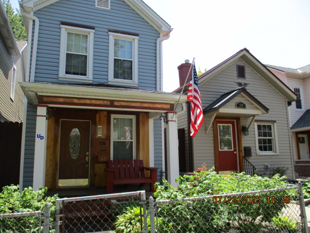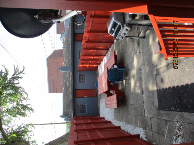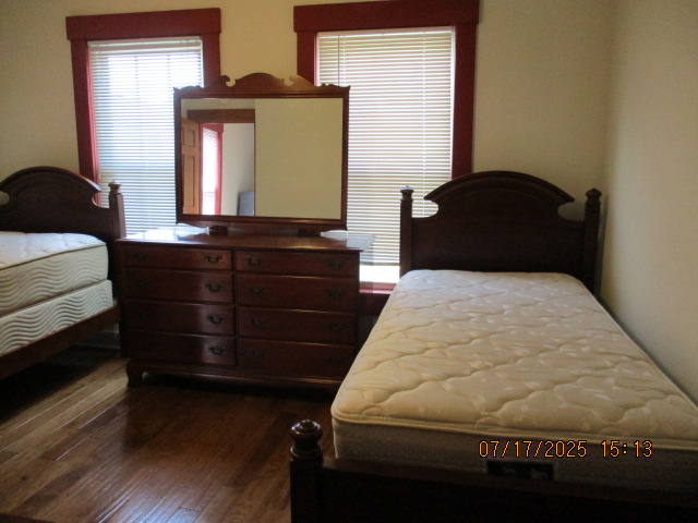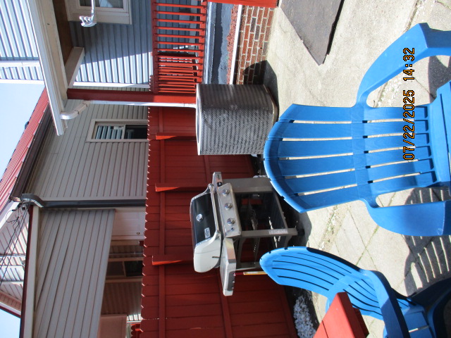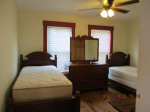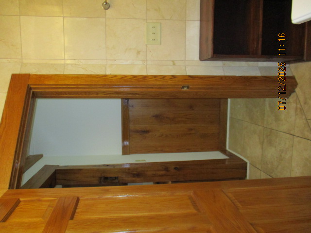 Kitchen with butcher block countertops with farmhouse sink, tile flooring, custom built oak table with blue coral granite top, custom built wood staircase, cherry cabinets. Downstairs bathroom with Italian marble walls, oak vanity and tile flooring, commercial bathtub/shower Washer and dryer area with Speed Queen washer and dryer set, hallway, storage basement off of laundry area Privacy fenced in backyard with back patio area with picnic table, gas grill and gas firepit Upstairs bathroom with Italian marble tile walls, tile flooring, and bathtub/shower, and upstairs hallway and landing. Back upstairs bedroom currently with full bed, desk, dresser, ceiling fan, and cedar lined closet Middle upstairs bedroom currently with twin bed, desk, dressers, ceiling fan and cedar lined closet Front upstairs bedroom currently with two twin beds, desk, dresser, ceiling fan and cedar lined closet This page last updated 07/29/2025