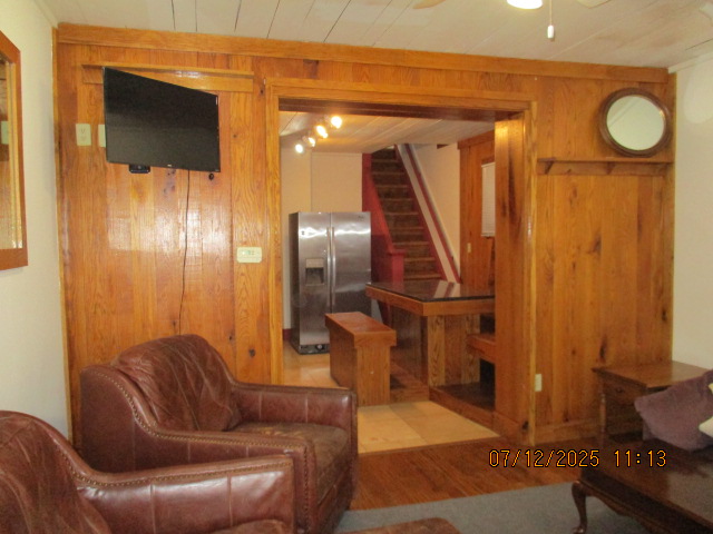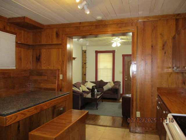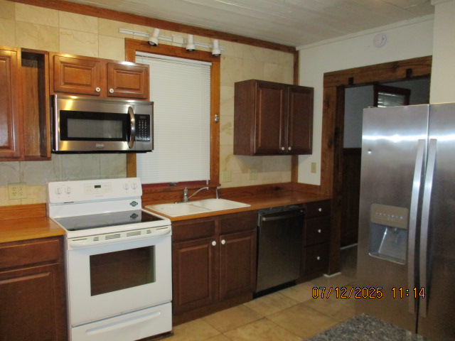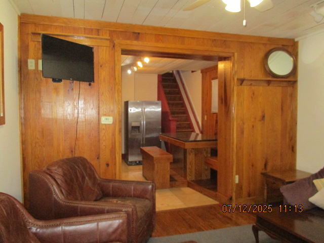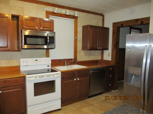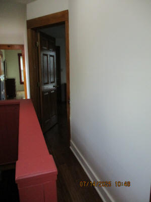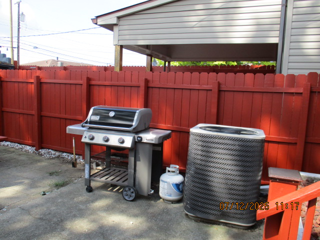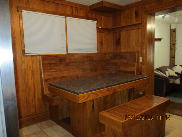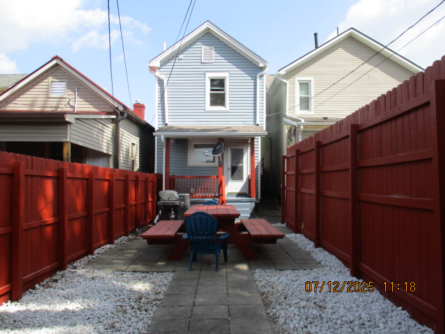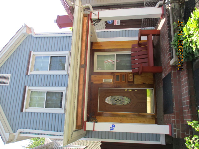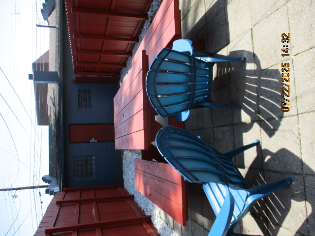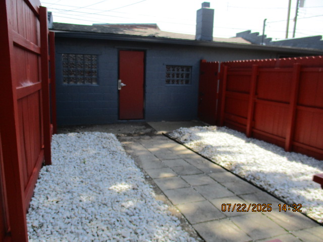 Kitchen with butcher block countertops with farmhouse sink, tile flooring, custom built oak table with blue coral granite top, custom built wood staircase, cherry cabinets. Downstairs bathroom with Italian marble walls, oak vanity and tile flooring, commercial bathtub/shower Washer and dryer area with Speed Queen washer and dryer set, hallway, storage basement off of laundry area Privacy fenced in backyard with back patio area with picnic table, gas grill and gas firepit Upstairs bathroom with Italian marble tile walls, tile flooring, and bathtub/shower, and upstairs hallway and landing. Back upstairs bedroom currently with full bed, desk, dresser, ceiling fan, and cedar lined closet Middle upstairs bedroom currently with twin bed, desk, dressers, ceiling fan and cedar lined closet Front upstairs bedroom currently with two twin beds, desk, dresser, ceiling fan and cedar lined closet This page last updated 07/29/2025