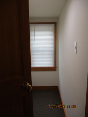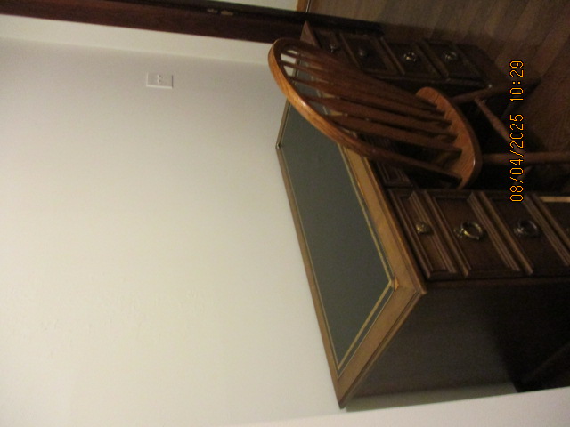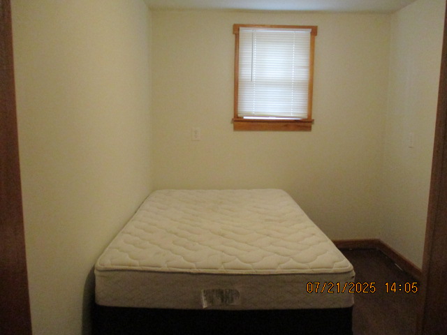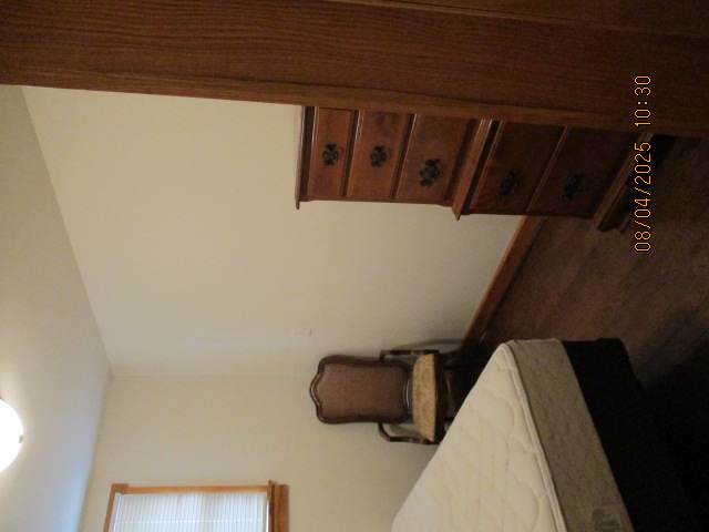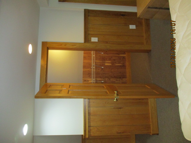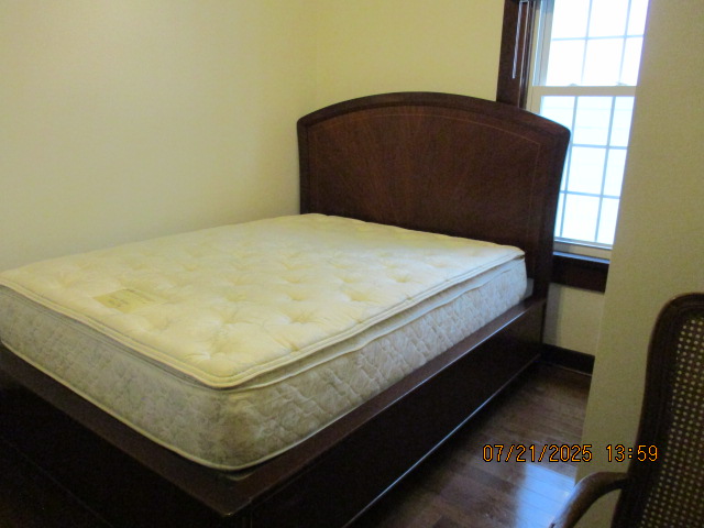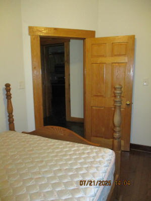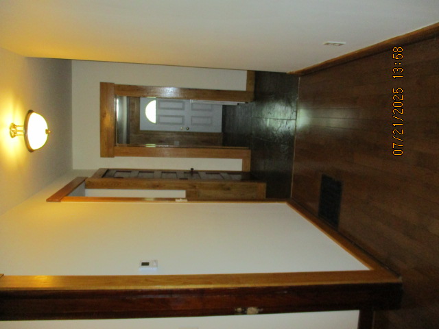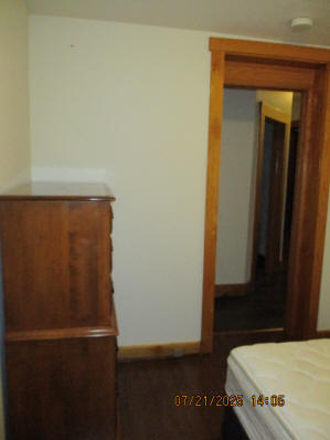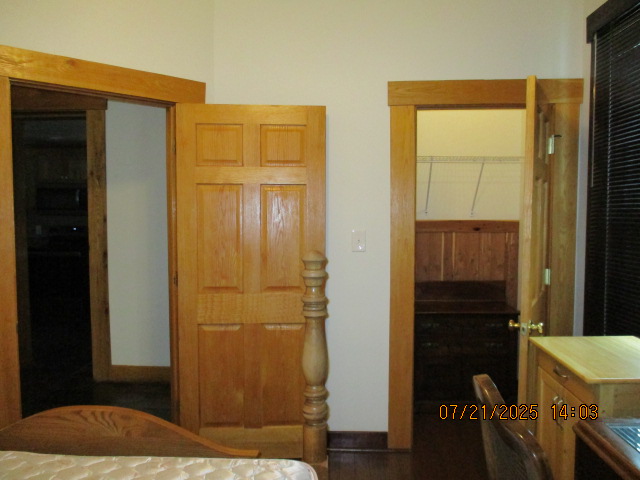 Middle downstairs bedroom with solid oak wood flooring, cedar lined closet, ceiling fan, and currently with queen bed Downstairs study area and hallway leading to bathroom, upstairs loft area, and basement entrance, study room currently with full bed, desk, and dresser