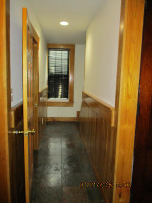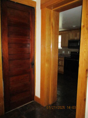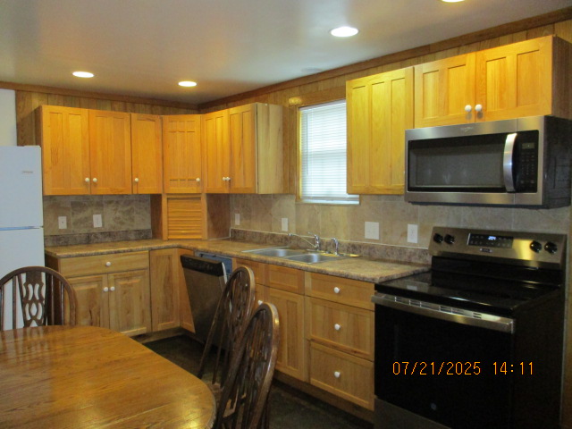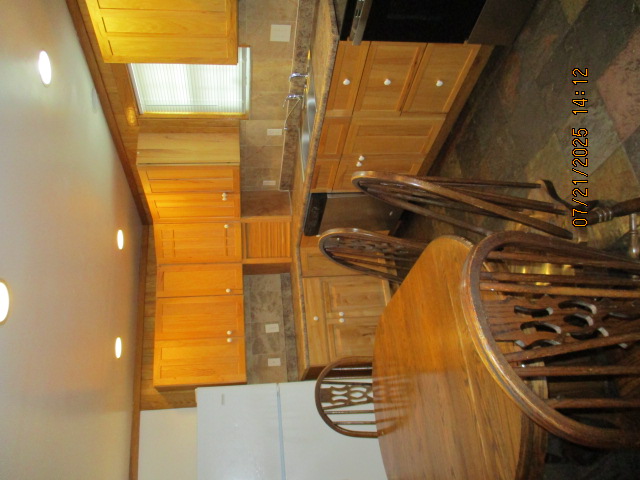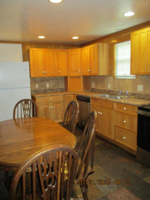 Kitchen with hickory cabinets, oak wainscoting, microwave, dishwasher, premium commercial grade washer and dryer, steel back entry door, and slate tile flooring.