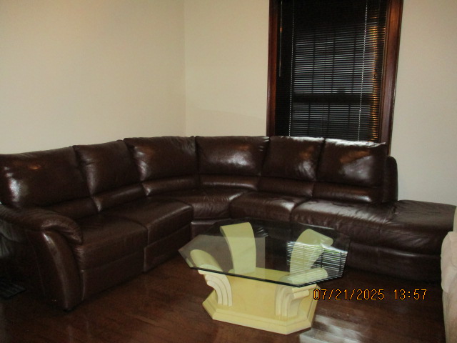 Living Room with solid oak wood flooring, ceiling fan, leather sectional sofa, and steel front entrance door with black walnut trim, hallway leading to downstairs bedrooms. Front downstairs bedroom with solid oak wood flooring, cedar lined closet, currently with queen wood bed, desk, dresser, and ceiling fan.