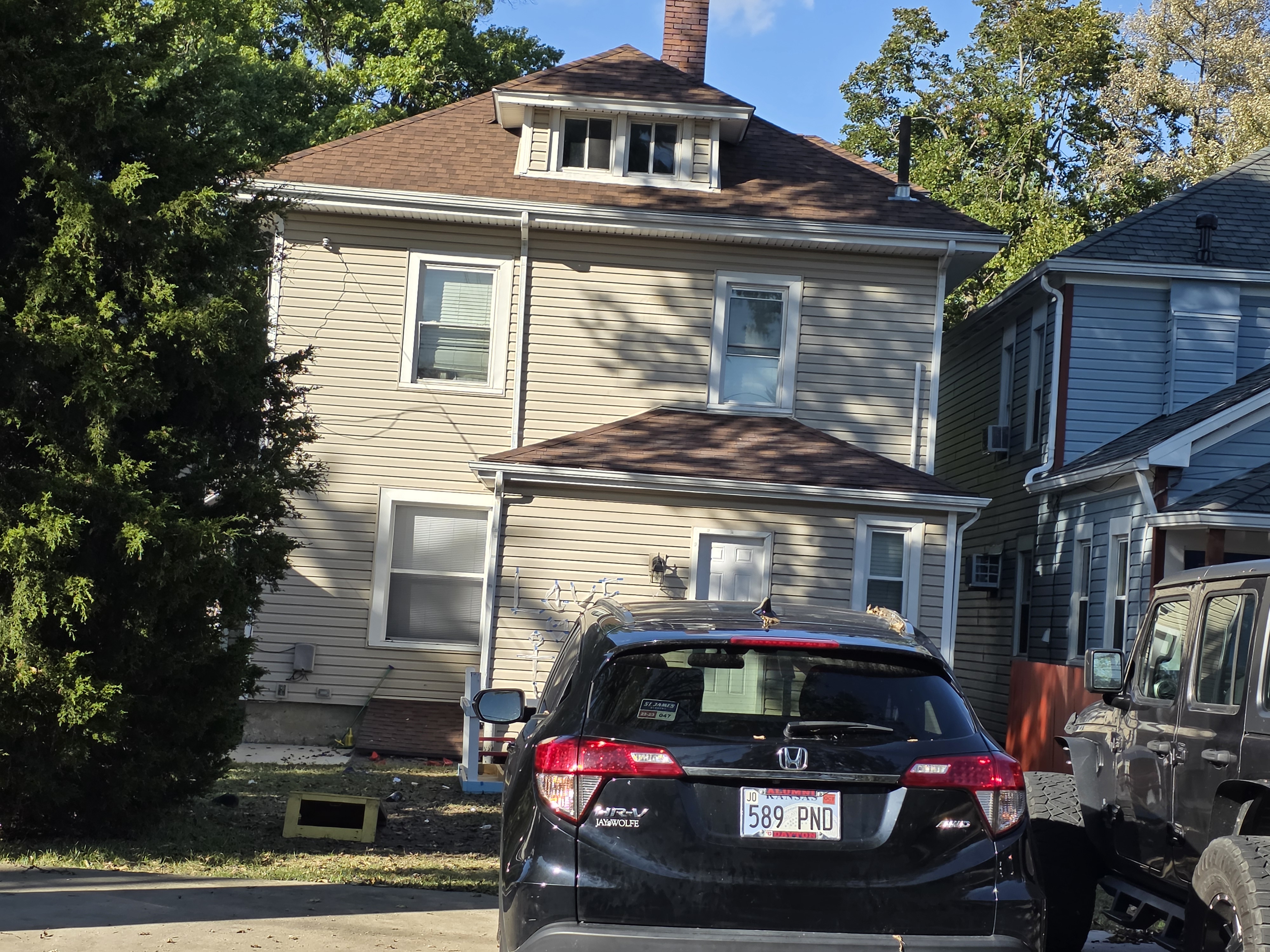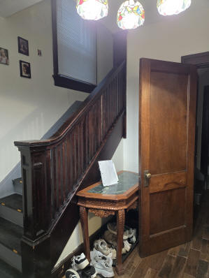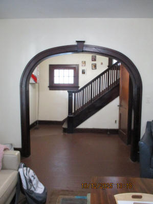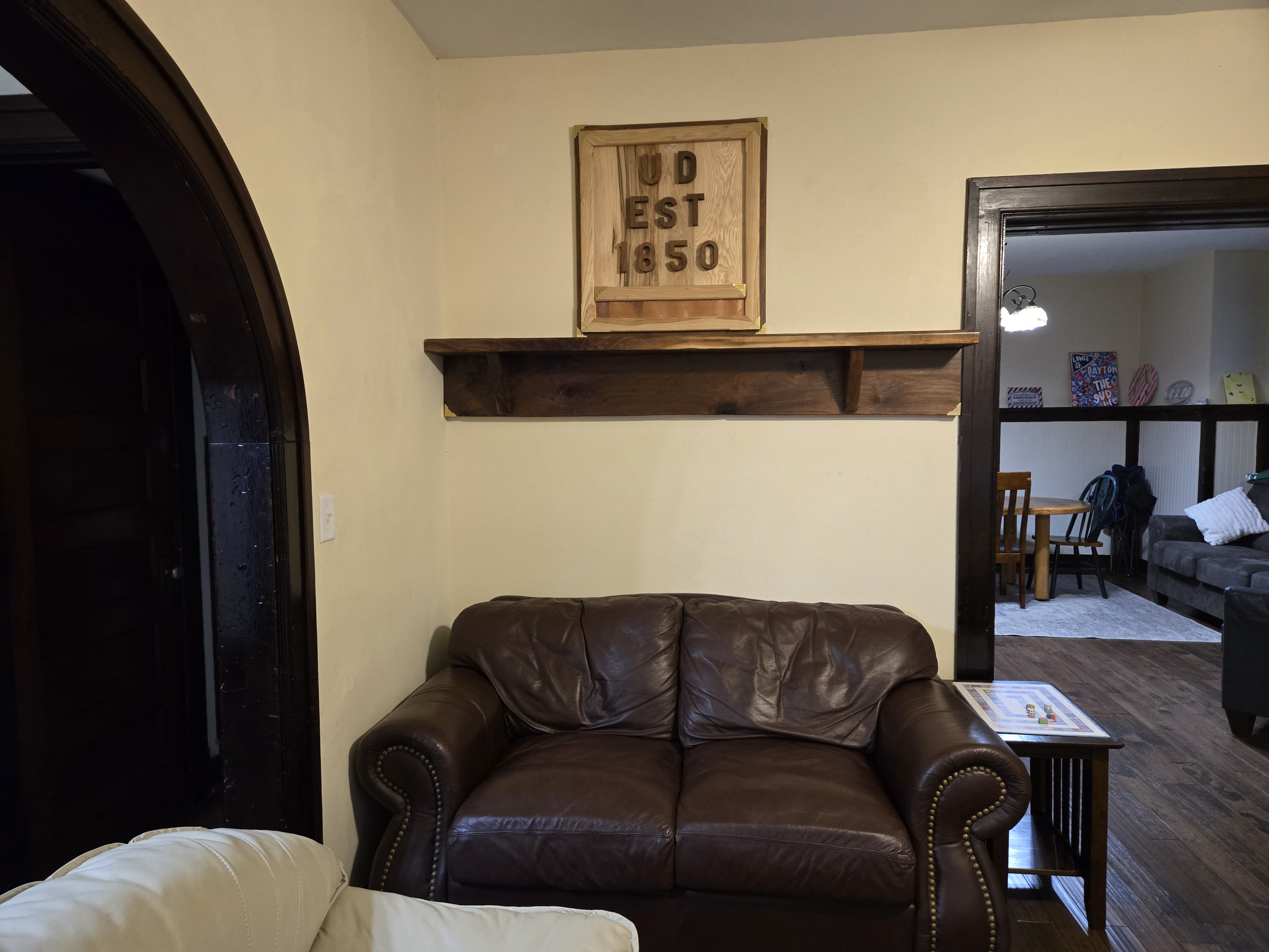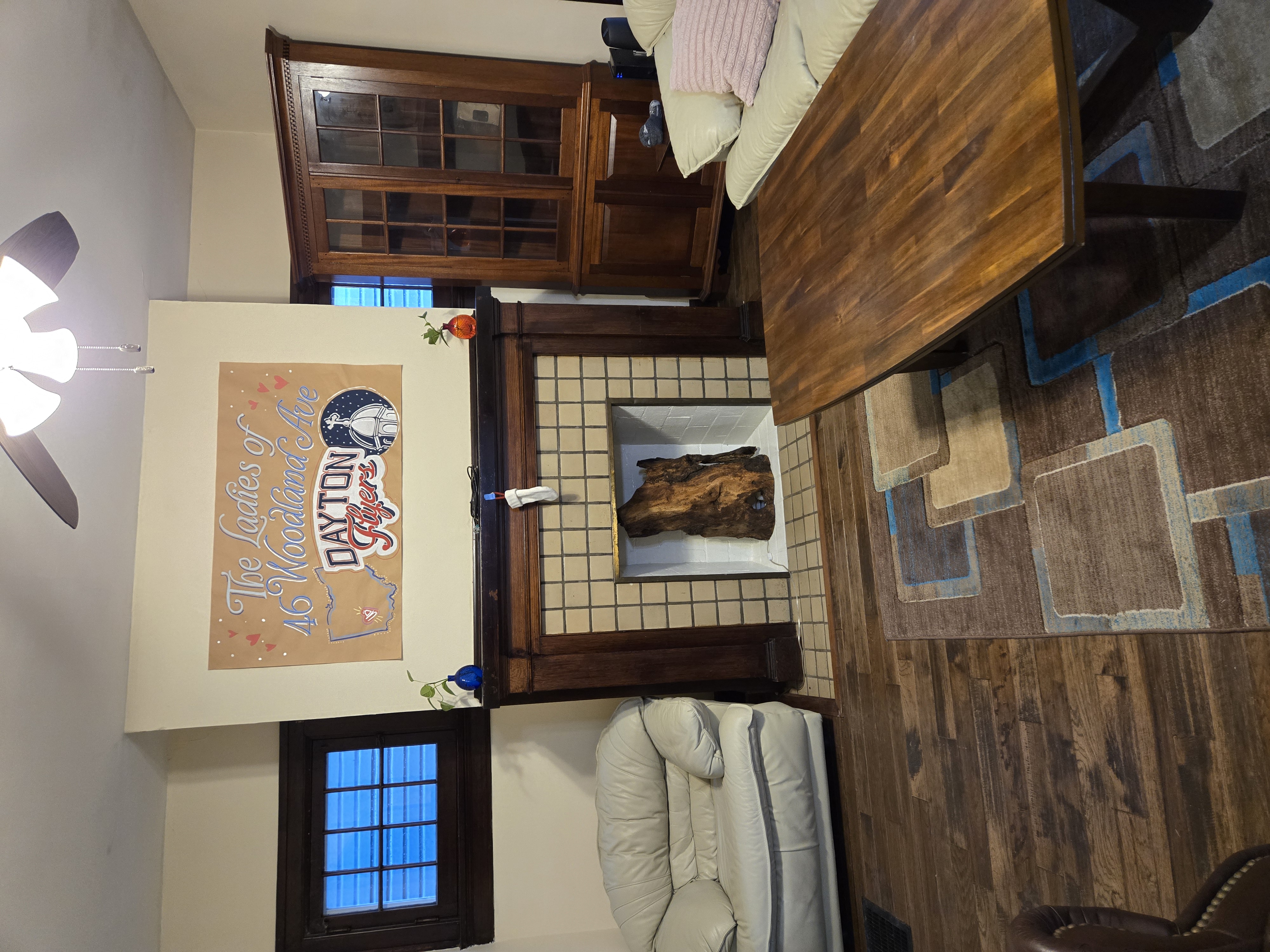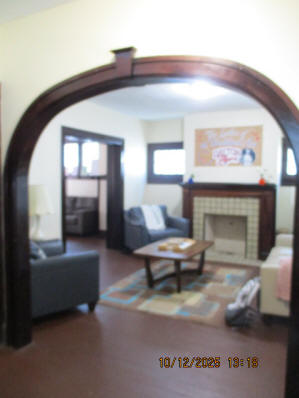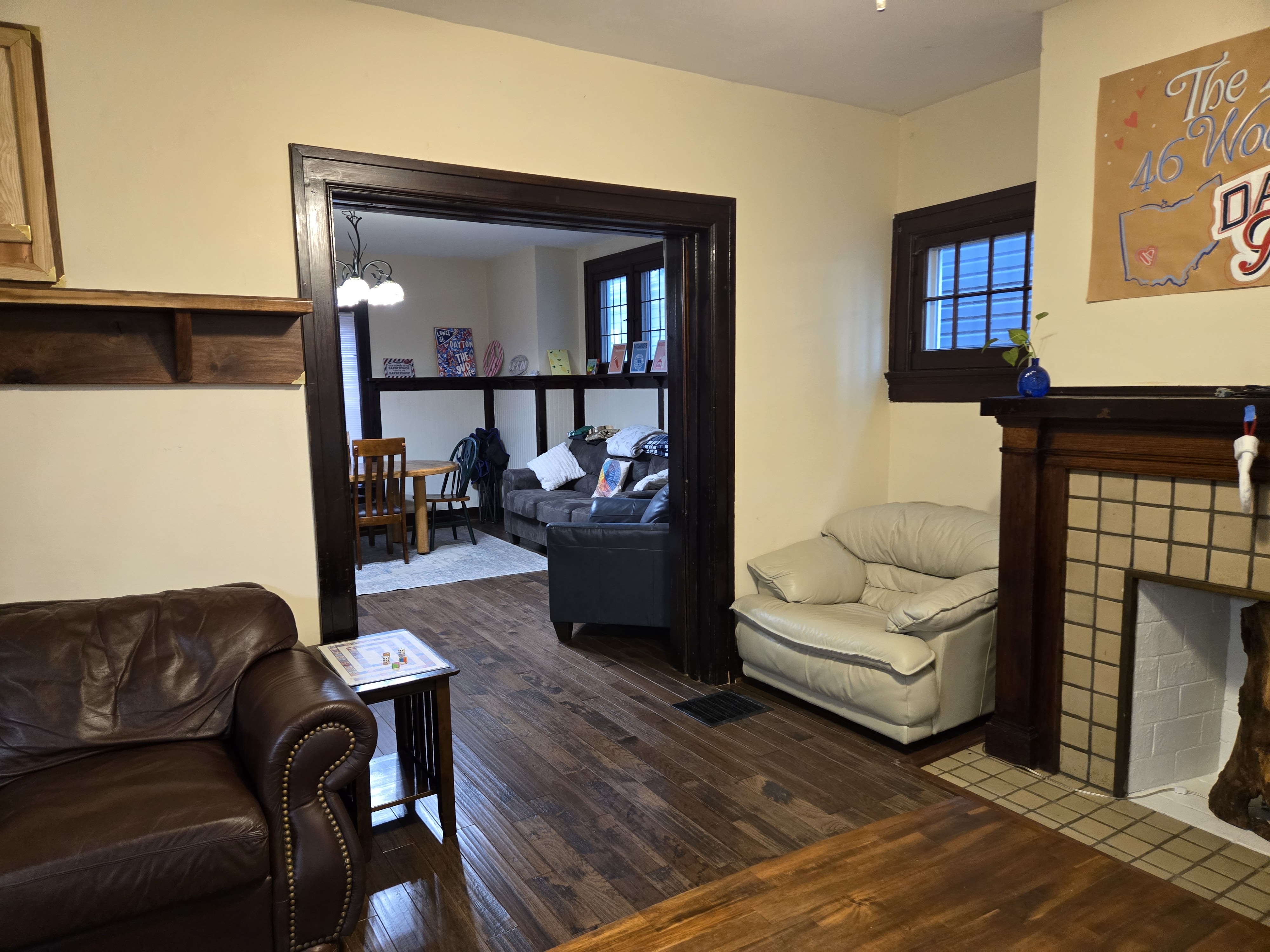 46 Woodland Avenue - right next door to our Tiki house at 48 and 50 Woodland Avenue This property has the following features: 3 large bedrooms, licensed to six students, one and half bathrooms, upstairs laundry, large living room and dining room, beautiful original wood front entry door and wood staircase, central heat and air conditioning, will be fully furnished, will have a nice new concrete pad in backyard, picnic table, new grill, hammock, beatiful stones in backyard this summer. Best of all, you are half a block from campus and all the fine restaurants!! As with all our properties, maintenance is included. (Click on any of the below pictures to see an enlarged view) New updated pictures at the beginning of each room section. Recent updates over winter break: new toilets, new dishwasher, new hardwood hickory flooring installed down stairs, new stair treads for upstairs staircases and basement staircase, new picnic table, hammock, adirondack chair added in backyard, new lighting in kitchen, living and dining rooms; large multi room basement cleaned out, painted and dry locked, new glass block windows and furniture, a great space to hang out in! More front and current back yard views (back yard to have poured concrete pad in backyard, new grill, hammock, picnic table, large stones added this summer Good size living room with faux fireplace, beautiful wood staircase and original wood front entry door Good size kitchen with dishwasher, microwave, built in storage cabinet, new lighting, new dishwasher Storage room off of kitchen by back entrance, cleaned out and painted Downstairs half bathroom off of kitchen, repainted and new toilet LLLarge dining room, new hardwood hickory flooring new lighting Large living room with faux fireplace, beautiful original wood front entry door, beautiful wood staircase, new hardwood hickory flooring, new stair treads, new cabinet, custom UD sign, new lighting Newly cleaned out basement with plenty of space to gather, with new glass block windows, tabe and chairs, stair treads Current backyard, with hammock, picnic table, and adirondack chair, parking pad, (to be updated spring 2026 with poured concrete backyard space) Large upstairs bathroom with big shower, shelving unit, new toilet, new glass showe doors Upstairs laundry Triple bedroom with three closet spaces Double bedroom with two closet spaces Single bedroom, good size closet space Unfinished attic bonus space This page last updated 1/23/2026